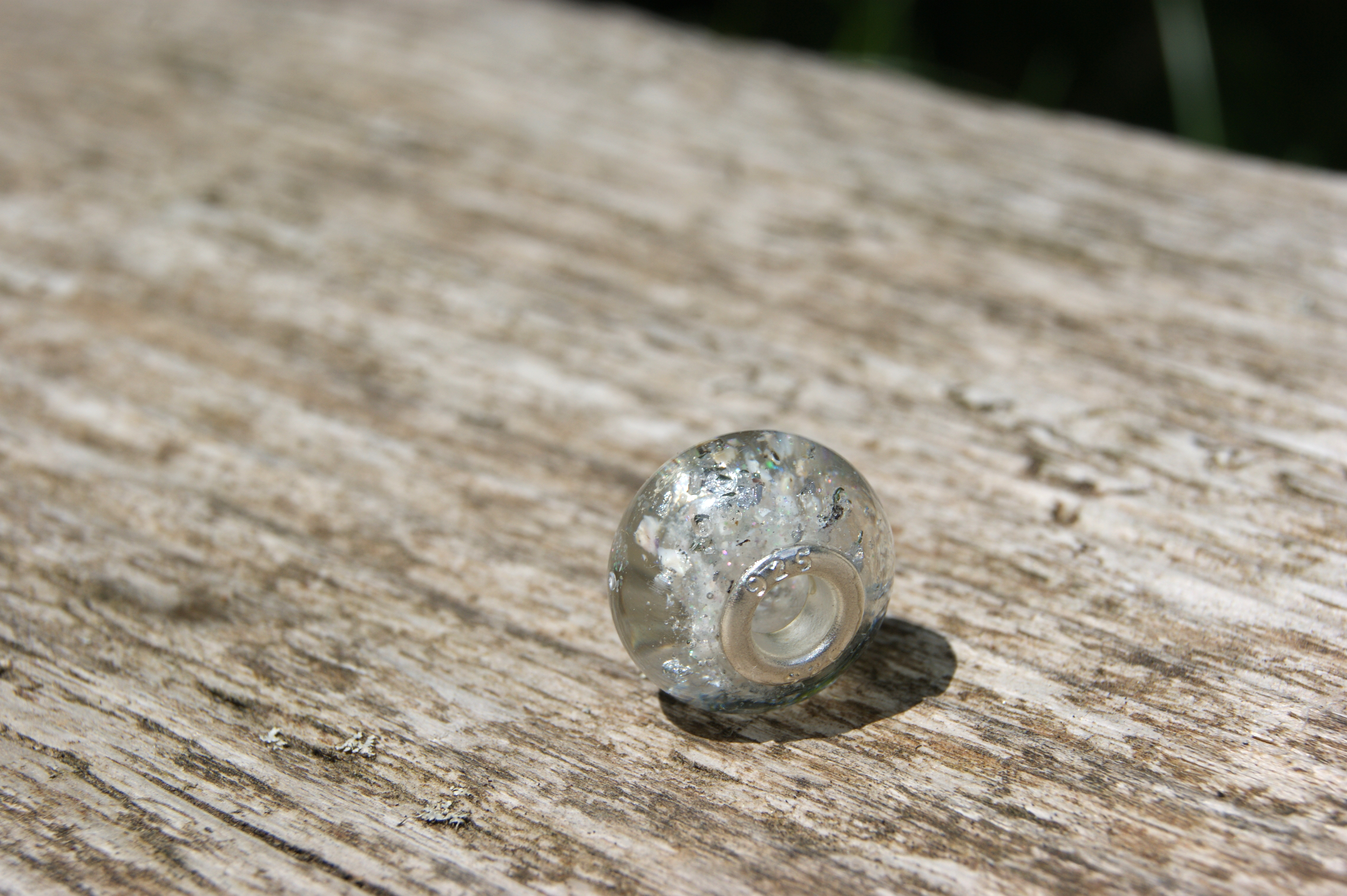 Einzigartige handgemachte klare Perle mit Asche und Silberflocken.