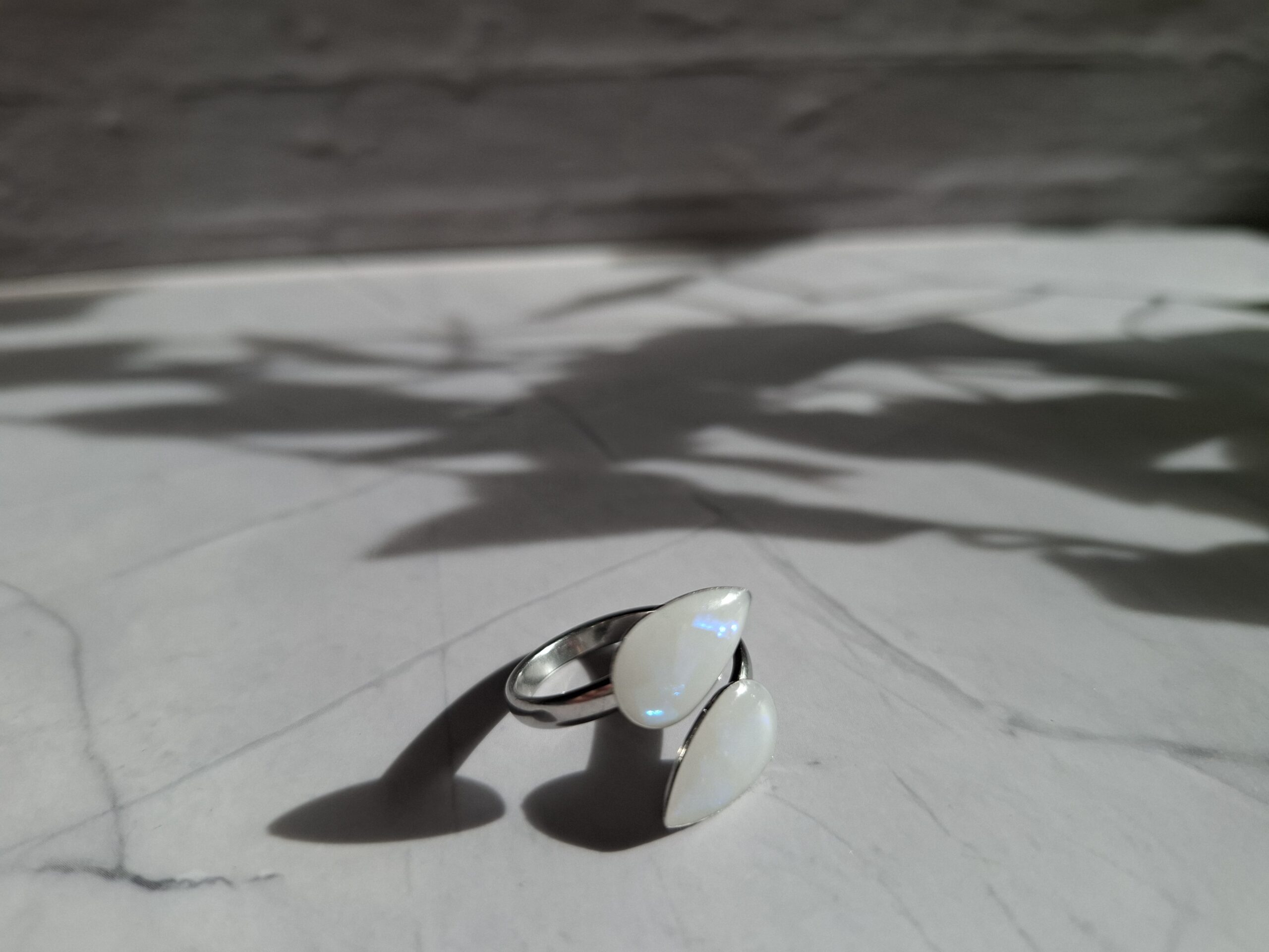 Ein eleganter, handgefertigter Edelstahlring in silberfarbener Optik, verziert mit einem schimmernden Opal-Look in sanfter Tränen- bzw. Tropfenform. Der Ring ist verstellbar und passt sich dank Einheitsgröße individuell an, wodurch er angenehm zu tragen ist und zu jedem Outfit passt. Ein stilvolles Accessoire mit zeitloser Eleganz – perfekt als besonderes Schmuckstück für dich selbst oder als Geschenk.
